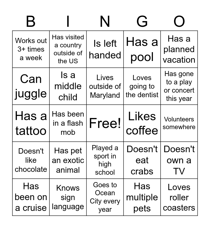 This bingo card has a free space and 34 words: Has met a celebrity, Has multiple pets, Is an Orioles fan, Plays an instrument, Doesn't like chocolate, Is a middle child, Has a planned vacation, Has been on a cruise, Has visited a country outside of the US, Owns more than one MD state flag themed item, Lives outside of Maryland, Is left handed, Has been to the west coast, Went to a Ravens game last season, Likes coffee, Has gone to a play or concert this year, Knows sign language, Has a tattoo, Has pet an exotic animal, Doesn't eat crabs, Played a sport in high school, Enjoys gardening, Works out 3+ times a week, Volunteers somewhere, Goes to Ocean City every year, Loves roller coasters, Has a pool, Favorite season is winter, Loves going to the dentist, Can juggle, Likes going to the movies, Has been in a flash mob, Doesn't own a TV and Knows how to roller skate.