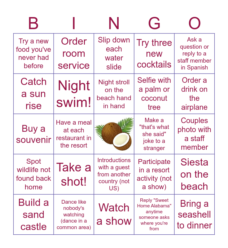 This bingo card has a free space and 24 words: Take a shot!, Dance like nobody's watching (dance in a common area), Night stroll on the beach hand in hand, Build a sand castle, Ask a question or reply to a staff member in Spanish, Try a new food you've never had before, Catch a sun rise, Order room service, Make a "that's what she said" joke to a stranger, Introductions with a guest from another country (not US), Selfie with a palm or coconut tree, Buy a souvenir, Participate in a resort activity (not a show), Siesta on the beach, Night swim!, Reply "Sweet Home Alabama" anytime someone asks where you're from, Couples photo with a staff member, Slip down each water slide, Order a drink on the airplane, Have a meal at each restaurant in the resort, Bring a seashell to dinner, Spot wildlife not found back home, Try three new cocktails and Watch a show.