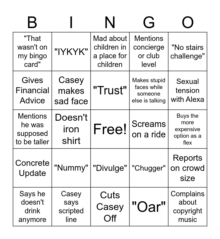 This bingo card has a free space and 24 words: "Nummy", Casey says scripted line, "Trust", Says he doesn't drink anymore, "No stairs challenge", "That wasn't on my bingo card", Gives Financial Advice, "IYKYK", Screams on a ride, "Divulge", Makes stupid faces while someone else is talking, Mentions he was supposed to be taller, "Chugger", Reports on crowd size, Casey makes sad face, "Oar", Buys the more expensive option as a flex, Mad about children in a place for children, Sexual tension with Alexa, Doesn't iron shirt, Complains about copyright music, Concrete Update, Mentions concierge or club level and Cuts Casey Off.
