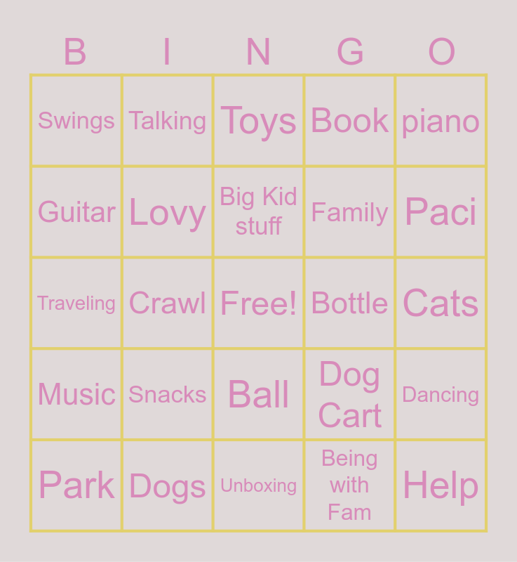 This bingo card has a free space and 29 words: Park, Games, Crawl, Tv, Swings, Toys, Lovy, Snacks, Bottle, Dogs, Cats, Help, Unboxing, Being with Fam, Paci, remotes, Ball, Music, piano, Traveling, Dog Cart, Playing, Family, Guitar, Book, Talking, Dancing, Big Kid stuff and Sleep.