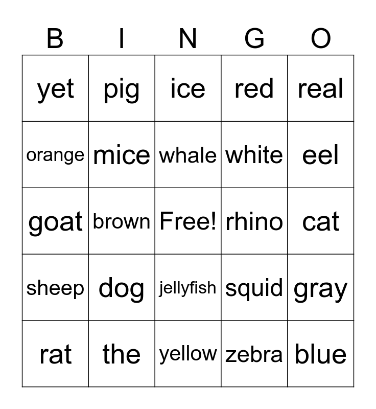 This bingo card has a free space and 34 words: camel, zebra, quail, lamb, sheep, mice, real, rat, pig, fish, whale, ice, cow, horse, rhino, eel, the, goat, dog, squid, jellyfish, top, yet, cat, yellow, blue, red, pink, white, orange, purple, brown, gray and black.