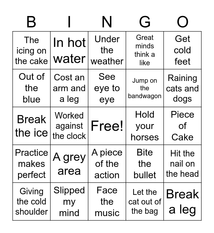 This bingo card has a free space and 24 words: A grey area, Slipped my mind, See eye to eye, Giving the cold shoulder, Get cold feet, The icing on the cake, Out of the blue, In hot water, Hold your horses, A piece of the action, Jump on the bandwagon, Break the ice, Bite the bullet, Hit the nail on the head, Cost an arm and a leg, Let the cat out of the bag, Piece of Cake, Under the weather, Raining cats and dogs, Worked against the clock, Break a leg, Practice makes perfect, Great minds think a like and Face the music.