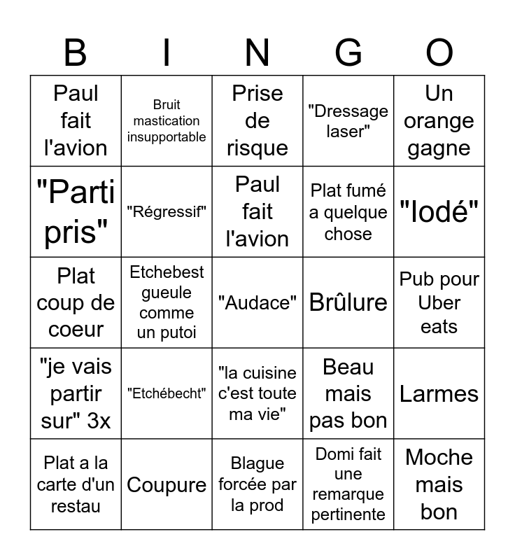 This bingo card has 30 words: Coupure, Un gris gagne, Etchebest gueule comme un putoi, "C'est malin", Paul fait l'avion, Prise de risque, "Régressif", "la cuisine c'est toute ma vie", Brûlure, Blague forcée par la prod, Pub pour Uber eats, "Audace", Domi fait une remarque pertinente, Moche mais bon, "Iodé", Cuisson ratée, Beau mais pas bon, "je vais partir sur" 3x, "Etchébecht", Un orange gagne, Plat coup de coeur, "C'est gourmand", Bruit mastication insupportable, Plat fumé a quelque chose, "Parti pris", "Dressage laser", Larmes, Plat a la carte d'un restau, Paul fait l'avion and Stéphanie dit qu'elle a fait Top Chef.