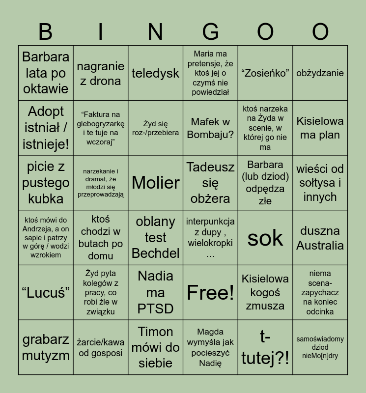 This bingo card has 36 words: Free!, Nadia ma PTSD, Magda wymyśla jak pocieszyć Nadię, Adopt istniał / istnieje!, ktoś mówi do Andrzeja, a on sapie i patrzy w górę / wodzi wzrokiem, Tadeusz się obżera, “Faktura na glebogryzarkę i te tuje na wczoraj”, Timon mówi do siebie, “Zosieńko”, Kisielowa kogoś zmusza, Kisielowa ma plan, Maria ma pretensje, że ktoś jej o czymś nie powiedział, niema scena-zapychacz na koniec odcinka, narzekanie i dramat, że młodzi się przeprowadzają, Mafek w Bombaju?, Barbara lata po oktawie, “Lucuś”, Barbara (lub dziod) odpędza złe, picie z pustego kubka, teledysk, Molier, ktoś chodzi w butach po domu, interpunkcja z dupy , wielokropki …, oblany test Bechdel, sok, nagranie z drona, ktoś narzeka na Żyda w scenie, w której go nie ma, żarcie/kawa od gosposi, Żyd się roz-/przebiera, obżydzanie, samoświadomy dziod nieMo[n]dry, grabarz mutyzm, duszna Australia, wieści od sołtysa i innych, Żyd pyta kolegów z pracy, co robi źle w związku and t-tutej?!.