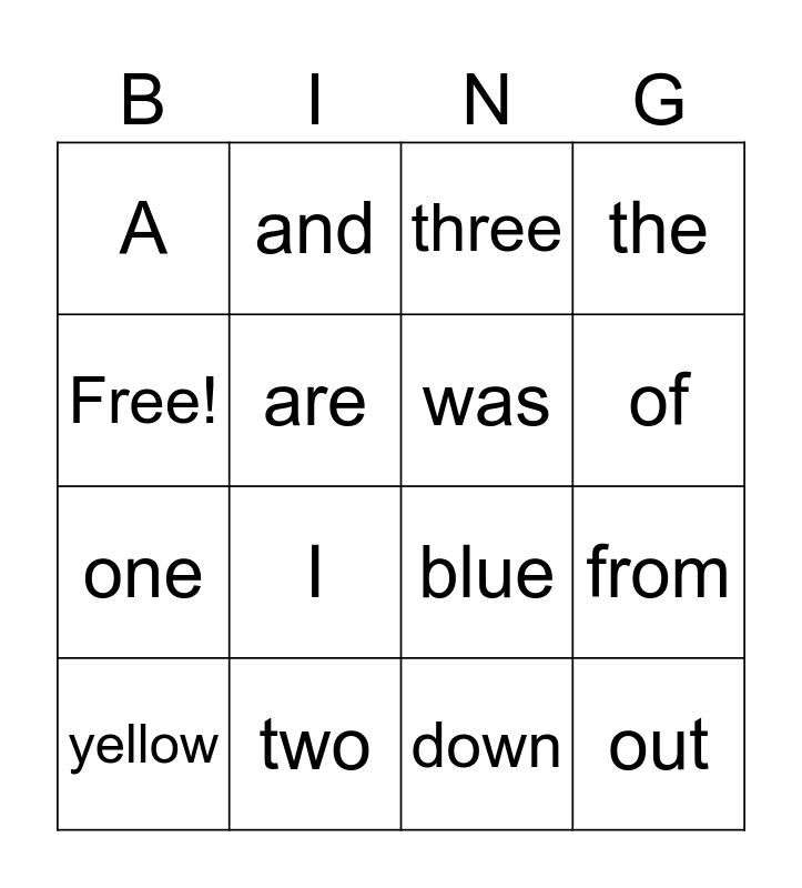 This bingo card has 18 words: Free!, two, three, the, one, and, blue, of, A, I, down, from, yellow, are, was, out, look and of.