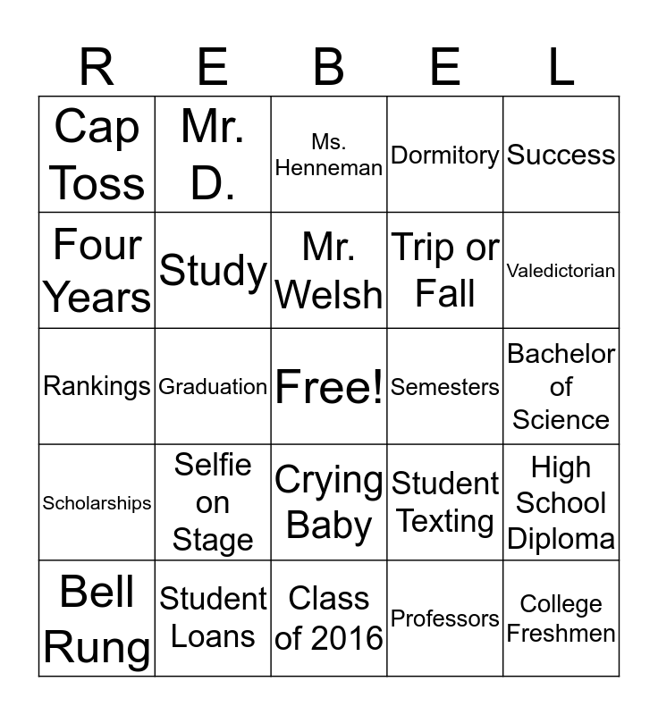 This bingo card has a free space and 34 words: Beach Ball, Professors, Responsibility, Roommate, Scholarships, Study, Success, Bell Rung, Mr. D., Joke Told, Mr. Welsh, Ms. Henneman, 1st Day of the Rest of your Life, Close your eyes and ..., Semesters, Valedictorian, Student Loans, Rankings, Selfie on Stage, Student Texting, Crying Baby, Crying Mom, Cap Toss, Bachelor of Science, Class of 2016, College Freshmen, Dormitory, Exams, Trip or Fall, Four Years, Future, Graduation, High School Diploma and Homework.