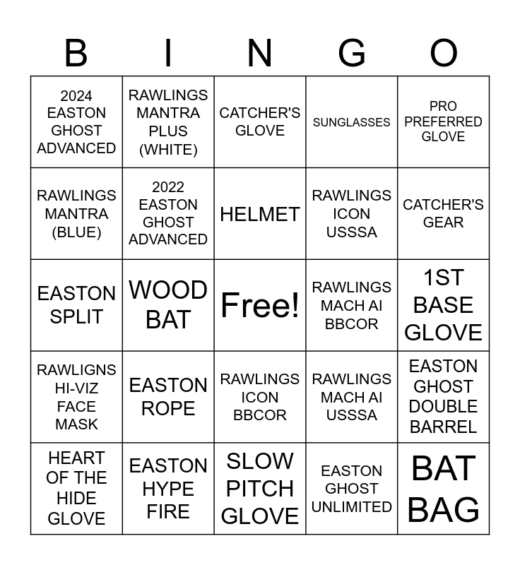This bingo card has a free space and 24 words: EASTON ROPE, EASTON HYPE FIRE, HELMET, HEART OF THE HIDE GLOVE, PRO PREFERRED GLOVE, 2024 EASTON GHOST ADVANCED, RAWLINGS MANTRA (BLUE), RAWLINGS MANTRA PLUS (WHITE), RAWLINGS MACH AI BBCOR, RAWLINGS ICON BBCOR, RAWLINGS ICON USSSA, EASTON SPLIT, RAWLINGS MACH AI USSSA, EASTON GHOST DOUBLE BARREL, 2022 EASTON GHOST ADVANCED, EASTON GHOST UNLIMITED, 1ST BASE GLOVE, CATCHER'S GLOVE, CATCHER'S GEAR, WOOD BAT, BAT BAG, RAWLIGNS HI-VIZ FACE MASK, SUNGLASSES and SLOW PITCH GLOVE.