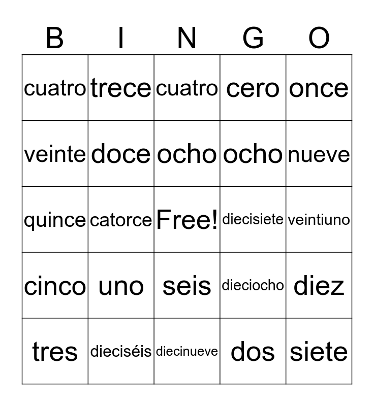 This bingo card has a free space and 24 words: uno, dieciséis, ocho, tres, once, cuatro, veinte, trece, diecisiete, seis, ocho, quince, dieciocho, diez, doce, dos, veintiuno, cuatro, nueve, catorce, siete, cinco, cero and diecinueve.