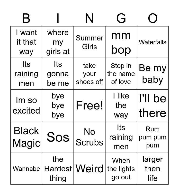 This bingo card has a free space and 29 words: Wannabe, Backstreets back, bye bye bye, You got it (the right stuff), I want it that way, Summer Girls, Its gonna be me, Sos, I like the way, the Hardest thing, I'll be there, larger then life, Weird, When the lights go out, Be my baby, Say my Name, No Scrubs, Black Magic, Waterfalls, Im so excited, Its raining men, Independent Woman, Stop in the name of love, Its raining men, mm bop, where my girls at, Rum pum pum pum, take your shoes off and ABC.