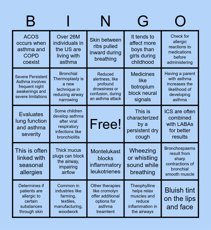 This bingo card has a free space and 24 words: Thick mucus plugs can block the airway, impairing airflow, Common in industries like farming, textiles, manufacturing, woodwork, Reduced alertness, like profound drowsiness or confusion, during an asthma attack, Determines if patients are allergic to certain substances through skin, Check for allergic reactions to medications before administering, ACOS occurs when asthma and COPD coexist, Severe Persistent Asthma involves frequent night awakenings and severe limitations, Over 26M individuals in the US are living with asthma, This is characterized by a persistent dry cough, Montelukast blocks inflammatory leukotrienes, Medicines like tiotropium block neural signals, Evaluates lung function and asthma severity, Wheezing or whistling sound while breathing, Bronchospasms result from sharp contractions of bronchial smooth muscle, Bronchial Thermoplasty is a new technique in reducing airway narrowing, Theophylline helps relax muscles and reduce inflammation in the airways, ICS are often combined with LABAs for better results, Skin between ribs pulled inward during breathing, Having a parent with asthma increases the likelihood of developing asthma, Some children develop asthma after viral respiratory infections like bronchiolitis, Bluish tint on the lips and face, This is often linked with seasonal allergies, It tends to affect more boys than girls during childhood and Other therapies like cromolyn offer additional options for asthma treamtent.