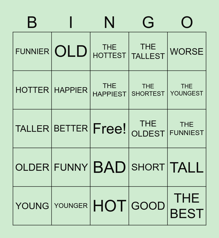 This bingo card has a free space and 27 words: SHORT, SHORTER, THE SHORTEST, HOT, HOTTER, THE HOTTEST, OLD, OLDER, THE OLDEST, TALL, TALLER, THE TALLEST, YOUNG, YOUNGER, THE YOUNGEST, HAPPY, HAPPIER, THE HAPPIEST, FUNNY, FUNNIER, THE FUNNIEST, GOOD, BETTER, THE BEST, BAD, WORSE and THE WORST.