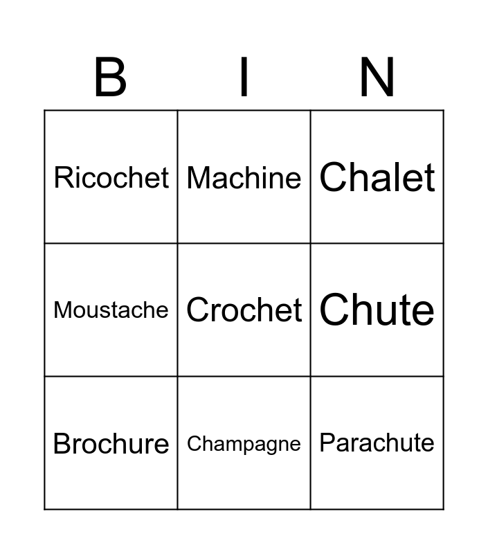 This bingo card has a free space and 8 words: Chute, Chalet, Machine, Brochure, Ricochet, Parachute, Moustache and Champagne.