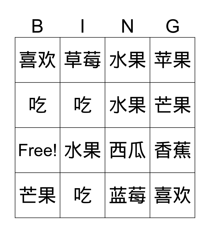 This bingo card has 28 words: 不, 葡萄, 西瓜, 猕猴桃, 喜欢, 吃, 水果, 香蕉, Free!, 芒果, 草莓, 苹果, 火龙果, 草莓, 蓝莓, 桃子, 吃, 水果, 香蕉, 芒果, 草莓, 苹果, 喜欢, 吃, 水果, 香蕉, 芒果 and 草莓.