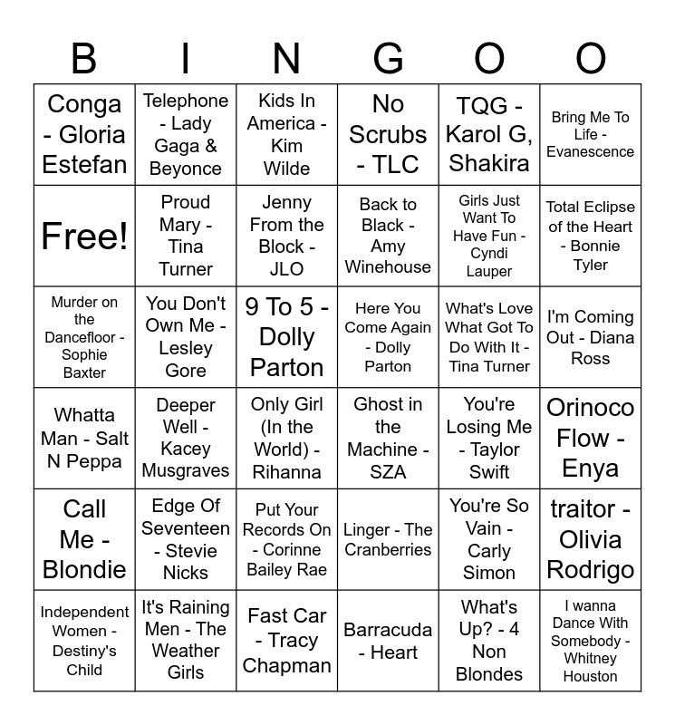 This bingo card has 47 words: Back to Black - Amy Winehouse, Murder on the Dancefloor - Sophie Baxter, Man! I Feel Like A Woman! - Shania Twain, You're Losing Me - Taylor Swift, What's Love What Got To Do With It - Tina Turner, Linger - The Cranberries, Telephone - Lady Gaga & Beyonce, Piece of My Heart - Janis Joplin, Bring Me To Life - Evanescence, It's Raining Men - The Weather Girls, Free!, No Scrubs - TLC, Deeper Well - Kacey Musgraves, Whatta Man - Salt N Peppa, What's Up? - 4 Non Blondes, Put Your Records On - Corinne Bailey Rae, Proud Mary - Tina Turner, You Don't Own Me - Lesley Gore, Free!, TQG - Karol G, Shakira, Total Eclipse of the Heart - Bonnie Tyler, Orinoco Flow - Enya, Conga - Gloria Estefan, Jenny From the Block - JLO, HOT TO GO! - Chappell Roan, Back to Black - Amy Winehouse, Only Girl (In the World) - Rihanna, Wannabe - Spice Girls, I'm Coming Out - Diana Ross, Here You Come Again - Dolly Parton, I'm a Survivor -Reba McEntire, Edge Of Seventeen - Stevie Nicks, Barracuda - Heart, I wanna Dance With Somebody - Whitney Houston, Fast Car - Tracy Chapman, Ghost in the Machine - SZA, 9 To 5 - Dolly Parton, Independent Women - Destiny's Child, These Boots Are Made For Walking - The Supremes, You're So Vain - Carly Simon, Call Me - Blondie, Kids In America - Kim Wilde, Girls Just Want To Have Fun - Cyndi Lauper, Whenever, Wherever - Shakira, Your Love Is My Drug - Kesha, traitor - Olivia Rodrigo and The Edge Of Glory - Lady Gaga.