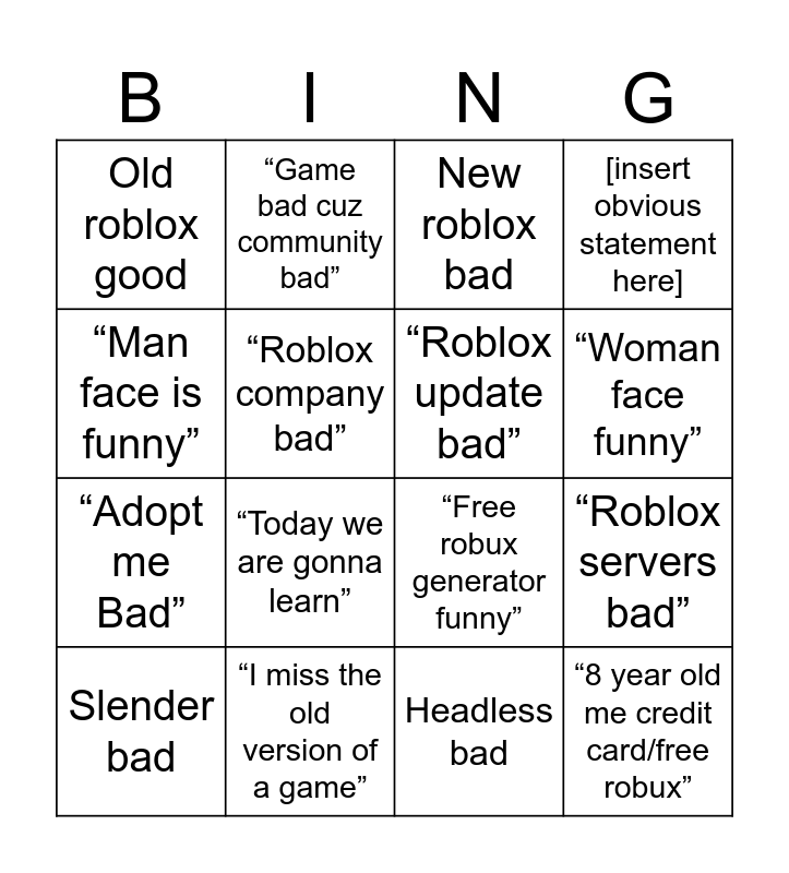 This bingo card has 17 words: Headless bad, Slender bad, New roblox bad, Old roblox good, “Today we are gonna learn”, [insert obvious statement here], “Roblox servers bad”, “Roblox update bad”, “Woman face funny”, “Roblox company bad”, “I miss the old version of a game”, “Free robux generator funny”, “Man face is funny”, “Game bad cuz community bad”, “Adopt me Bad”, “Blox fruits based sigma” and “8 year old me credit card/free robux”.