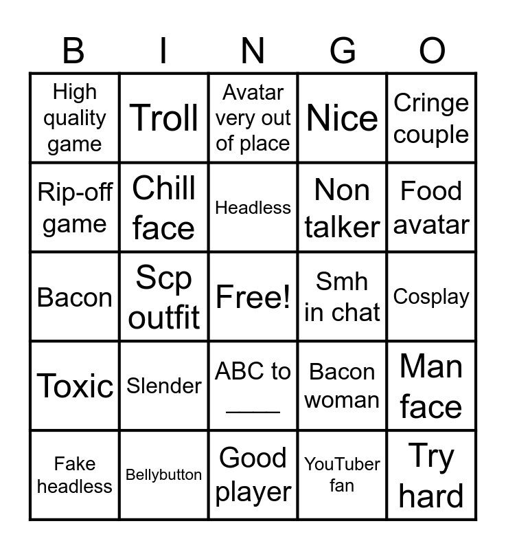 This bingo card has a free space and 24 words: Slender, Bellybutton, Headless, Fake headless, Cringe couple, High quality game, Rip-off game, Troll, Smh in chat, ABC to ____, Non talker, Bacon, Bacon woman, Man face, Chill face, YouTuber fan, Cosplay, Avatar very out of place, Food avatar, Scp outfit, Try hard, Toxic, Nice and Good player.