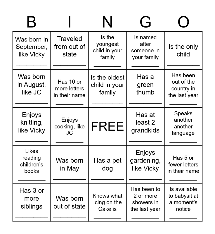 This bingo card has a free space and 24 words: Was born in May _________, Was born out of state _________, Is the oldest child in your family _________, Has 3 or more siblings _________, Is the only child _________, Was born in September, like Vicky _________, Was born in August, like JC _________, Traveled from out of state _________, Has at least 2 grandkids _________, Has a pet dog _________, Has a green thumb _________, Enjoys knitting, like Vicky _________, Enjoys gardening, like Vicky _________, Has 5 or fewer letters in their name _________, Has 10 or more letters in their name _________, Has been to 2 or more showers in the last year _________, Speaks another another language _________, Is the youngest child in your family _________, Has been out of the country in the last year _________, Enjoys cooking, like JC _________, Is available to babysit at a moment's notice _________, Likes reading children's books _________, Is named after someone in your family _________ and Knows what Icing on the Cake is _________.