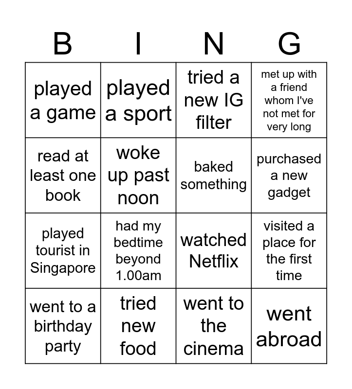 This bingo card has 16 words: tried new food, visited a place for the first time, tried a new IG filter, played a game, played tourist in Singapore, played a sport, watched Netflix, went to the cinema, read at least one book, woke up past noon, went to a birthday party, met up with a friend whom I've not met for very long, had my bedtime beyond 1.00am, purchased a new gadget, baked something and went abroad.
