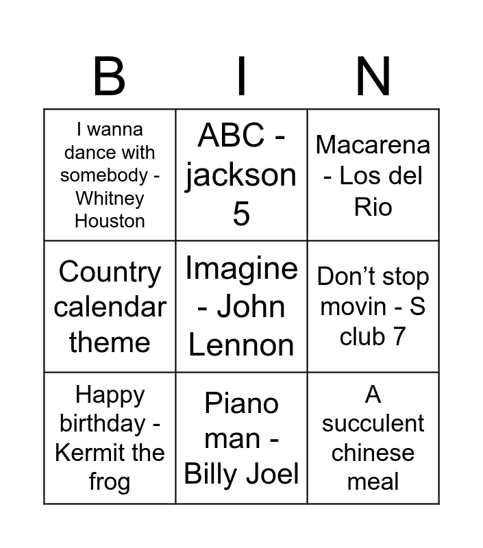 This bingo card has 31 words: Free!, Jingle bell rock - Bobby Helms, Valerie - Amy Winehouse, Sherry - The Four Seasons, I wanna dance with somebody - Whitney Houston, Macarena - Los del Rio, Happy birthday - Kermit the frog, Believe - Cher, Stairway to heaven - Led Zeppelin, Rock around the clock tonight - Bill Haley and his comets, Grease lightning - Grease, Over the rainbow - Judy Garland, Dancing queen - ABBA, All i want for christmas - John Key, No woman no cry - Bob Marley, Respect - Aretha Franklin, How's the serenity - Darryl Kerrigan, Material girl - Madonna, Bicycle race - Queen, Six months in the leaky boat - Split endz, Imagine - John Lennon, Feliz Navidad - Jose Feliciano, Twist and shout - The beatles, ABC - jackson 5, A succulent chinese meal, Don’t stop movin - S club 7, Country calendar theme, London calling - The clash, Hotel california - The Eagles, Piano man - Billy Joel and Life on mars - David Bowie.