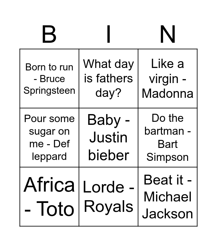This bingo card has 31 words: Free!, Hey jude - Beatles, Little shop of horrors - Urchins, Weather with you - Crowded house, Born to run - Bruce Springsteen, Like a virgin - Madonna, Africa - Toto, Bliss - th dudes, Hurt feelings - Flight of the conchords, Wandering eye - fat freddy's drop, Bob the builder theme, Mambo number 5 - Lou Bega, I’d do anything for love - Meatloaf, Around the world - Daft punk, If only I had time - John Roles, Kath and Kim theme, Big girls don’t cry - The Four seasons, Final countdown - Europe, Last Christmas - Wham, Who let the dogs out - Baha men, Baby - Justin bieber, Achy breaky Heart - Billy Ray Cyrus, Gutter black - Hello Sailor, What day is fathers day?, Beat it - Michael Jackson, Do the bartman - Bart Simpson, Pour some sugar on me - Def leppard, Faith - George Michael, I need a hero - Fairy godmother, Lorde - Royals and Thunderstruck - ACDC.