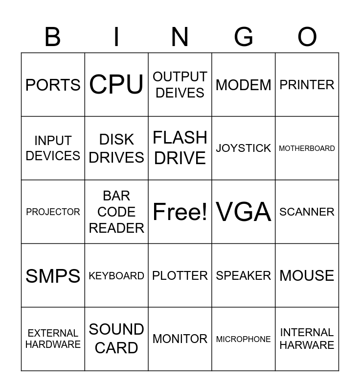 This bingo card has a free space and 24 words: KEYBOARD, SOUND CARD, FLASH DRIVE, EXTERNAL HARDWARE, PRINTER, PORTS, INPUT DEVICES, CPU, VGA, PLOTTER, JOYSTICK, PROJECTOR, SPEAKER, MOUSE, DISK DRIVES, MICROPHONE, SCANNER, OUTPUT DEIVES, MOTHERBOARD, BAR CODE READER, INTERNAL HARWARE, SMPS, MODEM and MONITOR.