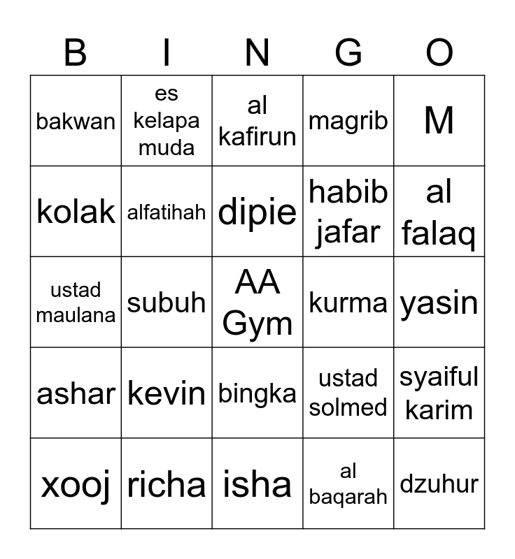 This bingo card has a free space and 24 words: kevin, richa, dipie, xooj, M, bakwan, kolak, es kelapa muda, kurma, bingka, habib jafar, ustad maulana, ustad solmed, syaiful karim, alfatihah, al baqarah, yasin, al kafirun, al falaq, subuh, dzuhur, ashar, magrib and isha.