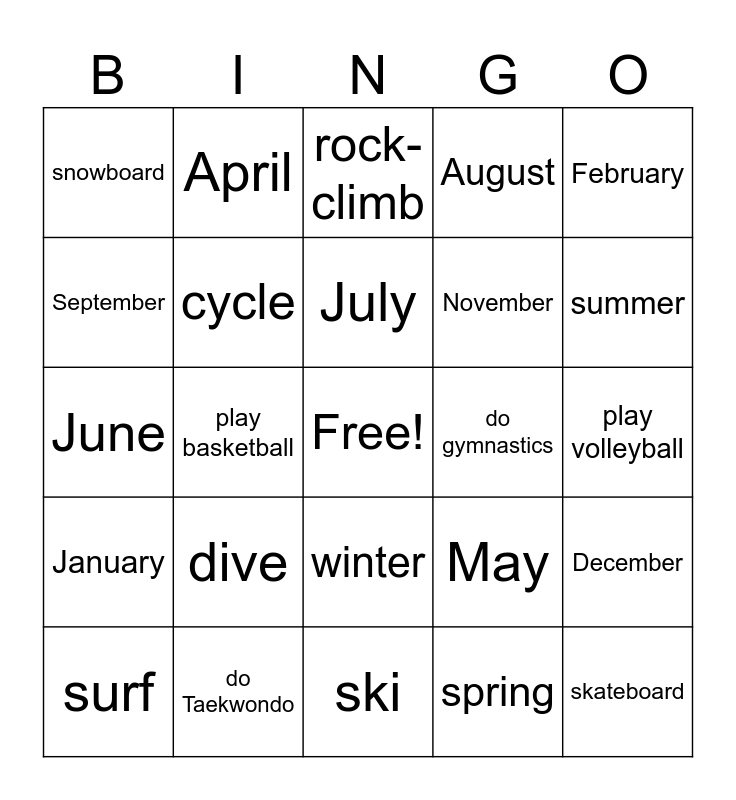 This bingo card has a free space and 29 words: surf, play tennis, play basketball, football, snowboard, rock-climb, cycle, dive, do gymnastics, do Taekwondo, play volleyball, skateboard, ski, spring, summer, autumn, winter, January, February, June, May, March, November, September, August, April, December, July and October.