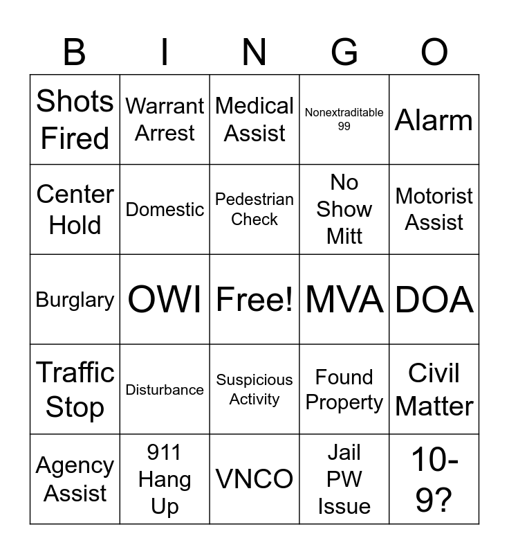 This bingo card has a free space and 33 words: Welfare Check, Property Damage, OWI, Lock Out, Traffic Stop, Domestic, Alarm, Agency Assist, Warrant Arrest, Noise Complaint, Pedestrian Check, Medical Assist, Theft, Harassment, MVA, Motorist Assist, 911 Hang Up, Burglary, Disturbance, Found Property, Suspicious Activity, Animal Control Issue, Shots Fired, DOA, VNCO, 10-9?, Nonextraditable 99, No Show Mitt, Center Hold, Civil Matter, Public Intox, Jail PW Issue and Misuse of 911.