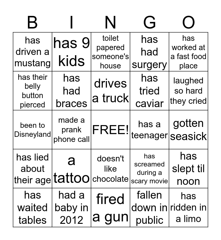 This bingo card has a free space and 24 words: a tattoo, had a baby in 2012, drives a truck, has waited tables, has worked at a fast food place, has driven a mustang, has their belly button pierced, has 9 kids, has a teenager, doesn't like chocolate, has tried caviar, been to Disneyland, has screamed during a scary movie, has slept til noon, has had braces, fallen down in public, gotten seasick, toilet papered someone's house, laughed so hard they cried, made a prank phone call, has ridden in a limo, has lied about their age, has had surgery and fired a gun.