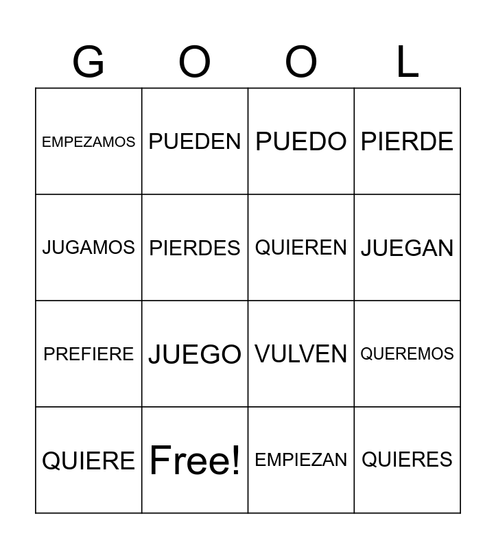 This bingo card has 29 words: QUIERO, DORMIMOS, QUEREMOS, DUERMO, EMPEZAMOS, PUEDO, QUIEREN, PREFERIMOS, Free!, PIERDEN, EMPIEZAN, QUIERE, PIENSAN, PIENSO, JUEGO, PIENSAS, EMPIEZO, QUIERES, JUGAMOS, VULVEN, PREFIEREN, VUELVE, PREFIERE, PIERDES, PIERDE, PUEDEN, PODEMOS, JUEGAN and VOLVEMOS.