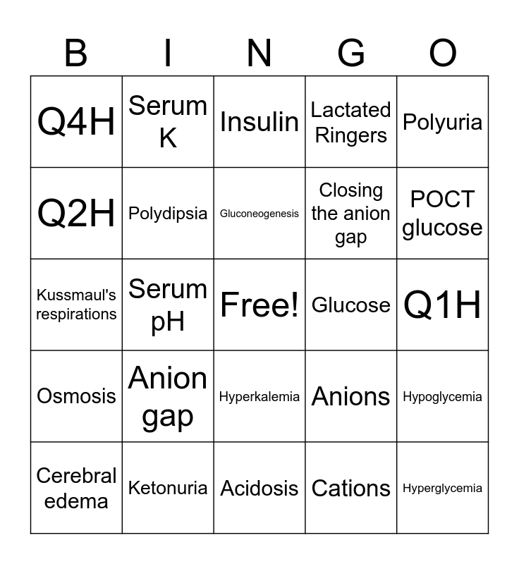 This bingo card has a free space and 24 words: Cerebral edema, Anion gap, Gluconeogenesis, Cations, Polyuria, Q4H, Serum K, Insulin, Glucose, Q1H, Kussmaul's respirations, Polydipsia, Anions, Hypoglycemia, Q2H, Ketonuria, Acidosis, Lactated Ringers, POCT glucose, Osmosis, Serum pH, Hyperkalemia, Closing the anion gap and Hyperglycemia.