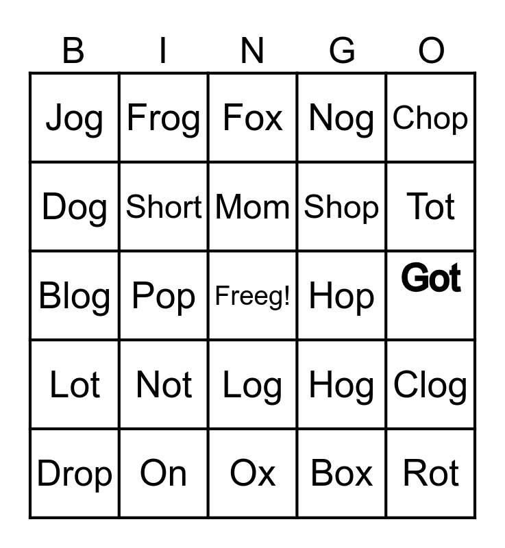 This bingo card has a free space and 24 words: Not, On, Mom, Drop, Chop, Jog, Dog, Frog, Hop, Log, Shop, Blog, Hog, Clog, Short, Box, Got, Fox, Tot, Pop, Rot, Lot, Nog and Ox.