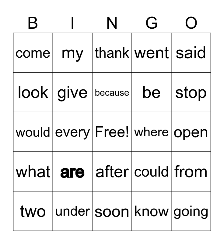 This bingo card has a free space and 24 words: are, under, because, two, said, come, look, my, where, after, be, would, could, from, give, know, open, thank, stop, every, going, what, went and soon.