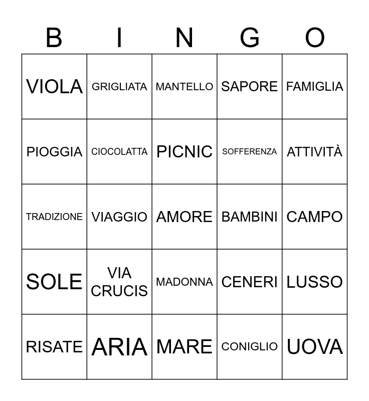 This bingo card has 34 words: UOVA, CONIGLIO, AMICI, FESTA, SOLE, CIOCOLATTA, FAMIGLIA, RISATE, GRIGLIATA, TORTA, PICNIC, MANTELLO, POSATE, GIOCHI, BAMBINI, ATTIVITÀ, ARIA, TRADIZIONE, VIA CRUCIS, CENERI, MADONNA, GESÙ, VIOLA, CAMPO, MARE, AMORE, SAPORE, VENTO, SOFFERENZA, PIOGGIA, NOIA, VIAGGIO, LUSSO and CENONE.