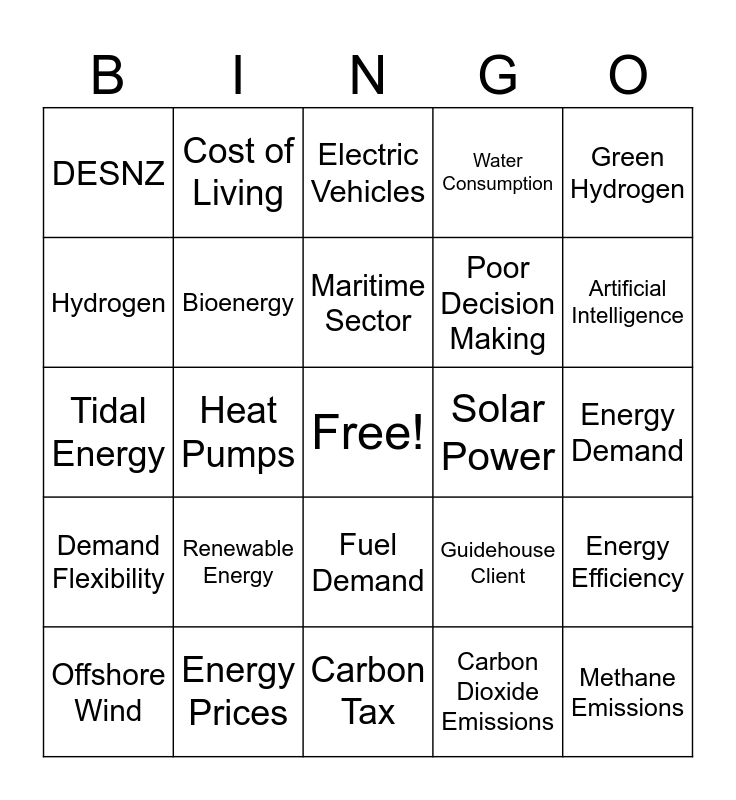 This bingo card has a free space and 29 words: Offshore Wind, Net-Zero, Heat Pumps, Decarbonisation, DESNZ, Electric Vehicles, Bioenergy, Renewable Energy, Solar Power, Energy Prices, Energy Demand, Methane Emissions, Carbon Tax, Carbon Dioxide Emissions, Artificial Intelligence, Carbon Capture and Storage, Fuel Demand, Demand Flexibility, Green Hydrogen, Tidal Energy, Guidehouse Client, Smart Meters, Poor Decision Making, Hydrogen, Water Consumption, Cost of Living, Energy Efficiency, Maritime Sector and Transportation.
