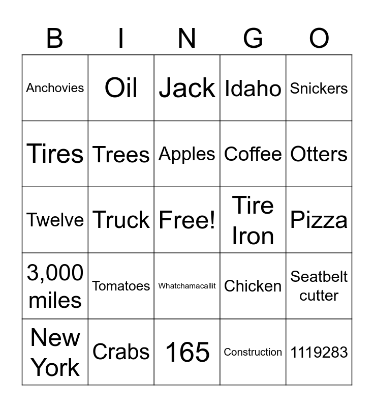 This bingo card has a free space and 27 words: Chicken, Pepper, Coffee, 165, Tires, Jack, Oil, 3,000 miles, Tire Iron, Seatbelt cutter, Twelve, Idaho, New York, Crabs, Otters, Porcupines, Trees, Apples, Tomatoes, Anchovies, Pizza, Construction, Truck, 1119283, Whatchamacallit, Snickers and 48.