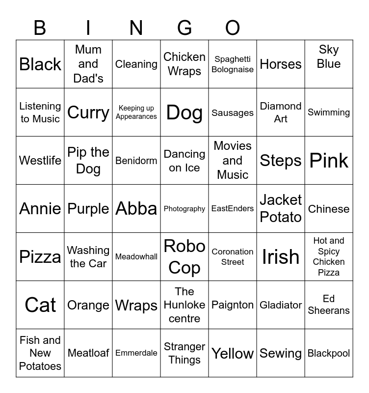 This bingo card has a free space and 55 words: Yellow, Pink, Blue, Black, Purple, Orange, Sky Blue, Red, Curry, Wraps, Chicken Wraps, Hot and Spicy Chicken Pizza, Chinese, Jacket Potato, Fish and New Potatoes, Pizza, Spaghetti Bolognaise, Sausages, Sewing, Diamond Art, Swimming, Washing the Car, Movies and Music, Cleaning, Walking, Listening to Music, Abba, Eighties, Westlife, Steps, Queen, Irish, Ed Sheerans, Meatloaf, Horses, Dog, Cat, Pip the Dog, Blackpool, Meadowhall, Mum and Dad's, The Hunloke centre, Paignton, Venice, Benidorm, Annie, Emmerdale, Coronation Street, EastEnders, Keeping up Appearances, Robo Cop, Gladiator, Stranger Things, Dancing on Ice and Jurassic Park.
