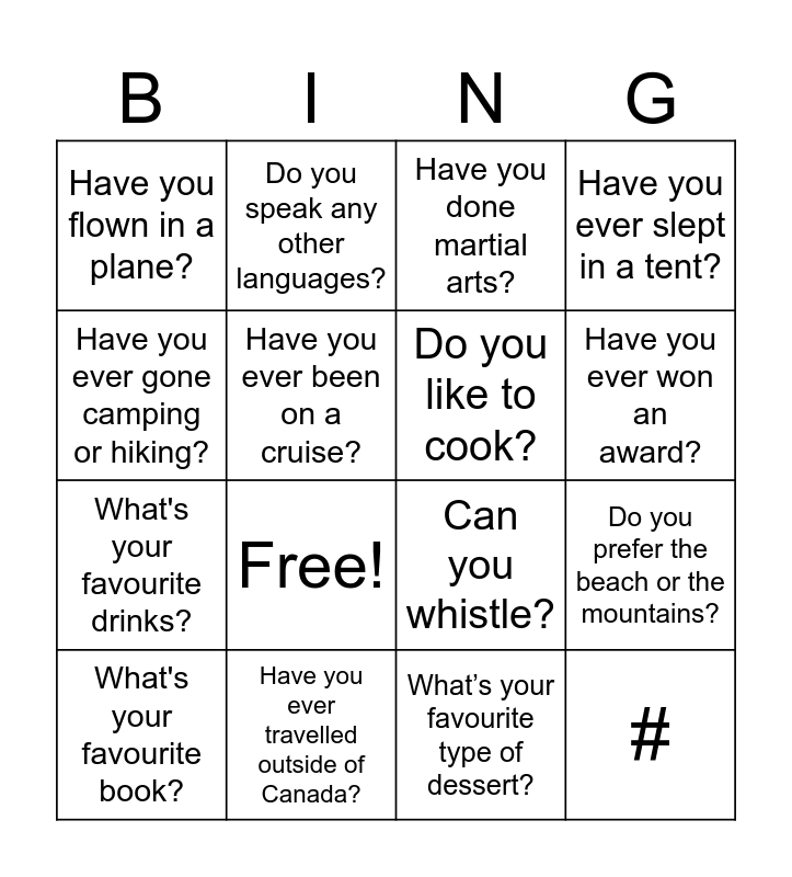 This bingo card has 18 words: Free!, #, Have you done martial arts?, Have you flown in a plane?, Can you whistle?, Have you ever slept in a tent?, What's your favourite book?, Do you speak any other languages?, Have you ever won an award?, What's your favourite drinks?, What’s your favourite type of dessert?, Have you ever gone camping or hiking?, Do you prefer the beach or the mountains?, Have you ever been on a cruise?, Do you like to cook?, What’s the hardest thing about school?, Have you ever travelled outside of Canada? and Do you know how to knit?.