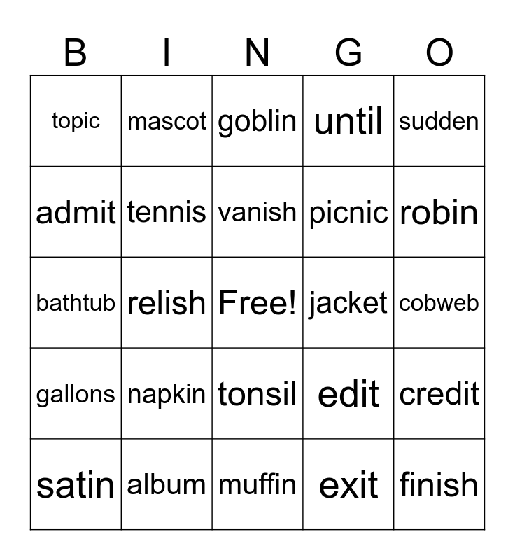 This bingo card has a free space and 29 words: satin, punish, relish, limit, topic, goblin, tennis, napkin, jacket, album, cobweb, finish, muffin, exit, robin, basket, tonsil, gallons, sudden, bathtub, edit, publish, picnic, admit, until, mascot, credit, vanish and rustic.