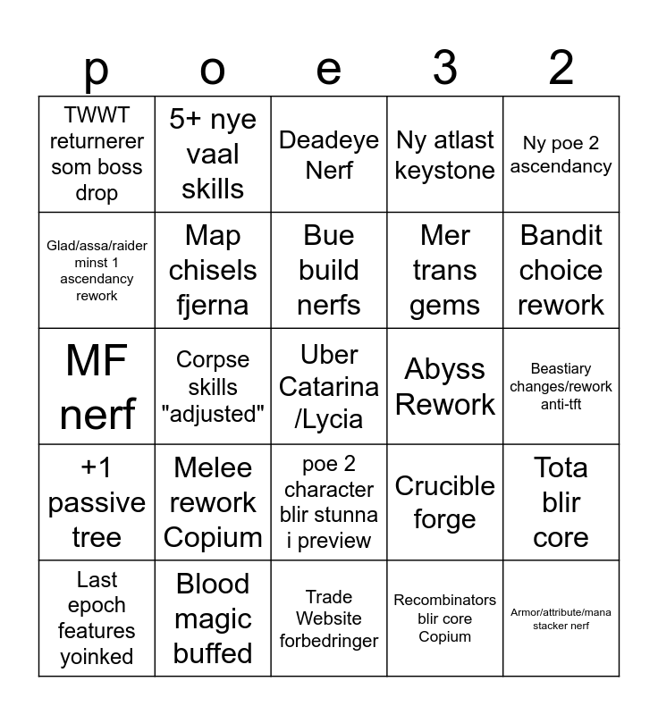 This bingo card has 25 words: Melee rework Copium, Trade Website forbedringer, Bue build nerfs, Last epoch features yoinked, Ny poe 2 ascendancy, TWWT returnerer som boss drop, Glad/assa/raider minst 1 ascendancy rework, 5+ nye vaal skills, Abyss Rework, poe 2 character blir stunna i preview, Mer trans gems, MF nerf, Crucible forge, Tota blir core, Map chisels fjerna, Armor/attribute/mana stacker nerf, Beastiary changes/rework anti-tft, Deadeye Nerf, Bandit choice rework, Corpse skills "adjusted", Uber Catarina /Lycia, Blood magic buffed, +1 passive tree, Ny atlast keystone and Recombinators blir core Copium.