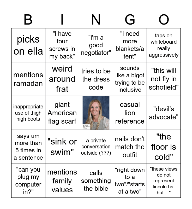This bingo card has a free space and 29 words: "can you plug my computer in?", firefighter hoodie, giant American flag scarf, grabs student's clothes/takes picture of student's clothes, picks on ella, "i'm a good negotiator", weird around frat, "sink or swim", casual lion reference, mentions family values, "devil's advocate", "these views do not represent lincoln hs, but....", calls something the bible, "right down to a two"/"starts at a two", "this will not fly in schofield", calls herself the old woman in the room, a private conversation outside (???), says um more than 5 times in a sentence, taps on whiteboard really aggressively, inappropriate use of thigh high boots, nails don't match the outfit, uses the eyebrows, sounds like a bigot trying to be inclusive, mentions ramadan, "i need more blankets/a tent", "i have four screws in my back", "the floor is cold", tries to be the dress code and due date negotiations.