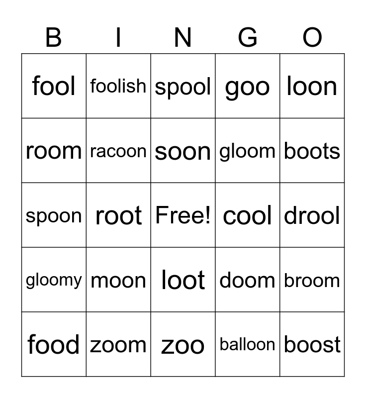 This bingo card has a free space and 24 words: food, moon, soon, balloon, loon, fool, foolish, spool, cool, drool, spoon, racoon, doom, broom, room, zoom, zoo, goo, boots, gloomy, root, loot, gloom and boost.