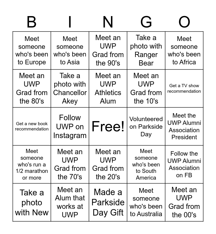 This bingo card has a free space and 24 words: Meet an UWP Grad from the 70's, Meet an Alum that works at UWP, Meet an UWP Athletics Alum, Take a photo with New, Meet someone who's been to Africa, Meet someone who's been to Europe, Meet an UWP Grad from the 80's, Meet someone who's been to Asia, Volunteered on Parkside Day, Meet an UWP Grad from the 20's, Meet an UWP Grad from the 10's, Get a new book recommendation, Meet someone who's been to South America, Follow the UWP Alumni Association on FB, Take a photo with Chancellor Akey, Meet someone who's been to Australia, Meet the UWP Alumni Association President, Meet an UWP Grad from the 90's, Get a TV show recommendation, Follow UWP on Instagram, Meet an UWP Grad from the 00's, Meet someone who's run a 1/2 marathon or more, Take a photo with Ranger Bear and Made a Parkside Day Gift.