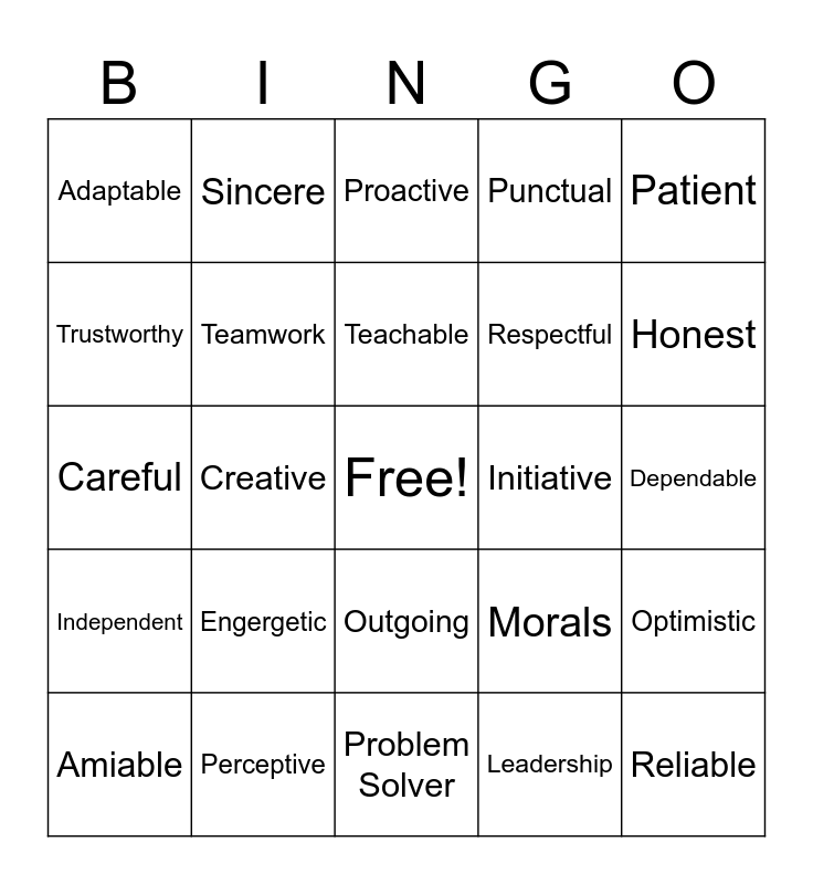 This bingo card has a free space and 31 words: Problem Solver, Communication, Creative, Resiliant, Adaptable, Proactive, Teamwork, Morals, Initiative, Leadership, Dependable, Reliable, Friendly, Flexible, Honest, Confident, Optimistic, Engergetic, Independent, Outgoing, Patient, Hardworking, Amiable, Sincere, Respectful, Trustworthy, Punctual, Careful, Perceptive, Teachable and Resourceful.
