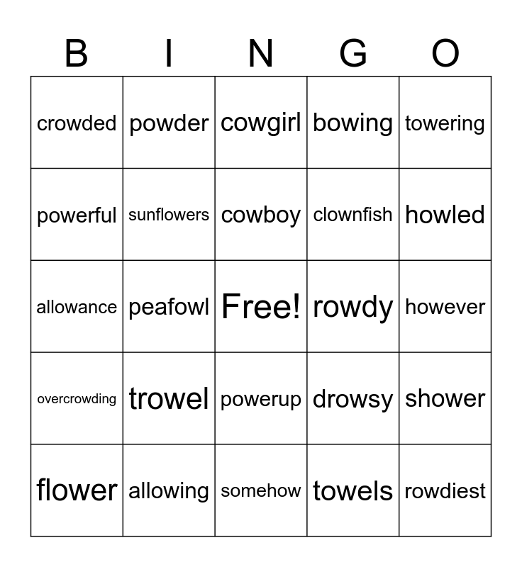This bingo card has a free space and 24 words: flower, trowel, cowboy, towels, towering, crowded, powder, cowgirl, rowdy, however, allowance, sunflowers, drowsy, shower, powerful, allowing, somehow, bowing, howled, overcrowding, peafowl, powerup, clownfish and rowdiest.