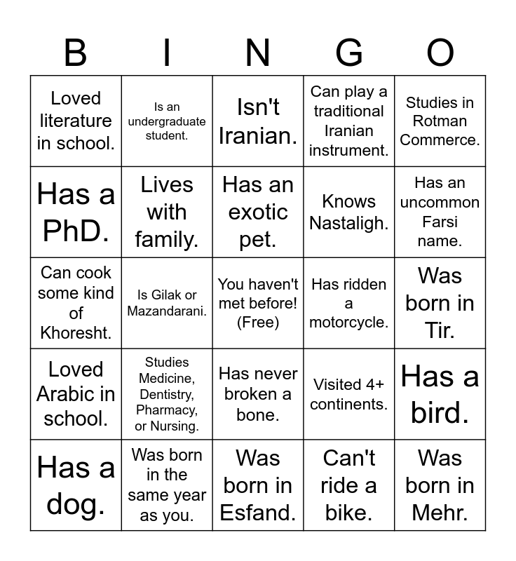This bingo card has a free space and 24 words: Studies Medicine, Dentistry, Pharmacy, or Nursing., Was born in the same year as you., Has an exotic pet., Has a dog., Studies in Rotman Commerce., Loved literature in school., Has a PhD., Is an undergraduate student., Has ridden a motorcycle., Has never broken a bone., Knows Nastaligh., Can cook some kind of Khoresht., Visited 4+ continents., Has a bird., Lives with family., Can't ride a bike., Was born in Tir., Isn't Iranian., Has an uncommon Farsi name., Is Gilak or Mazandarani., Was born in Mehr., Loved Arabic in school., Can play a traditional Iranian instrument. and Was born in Esfand..