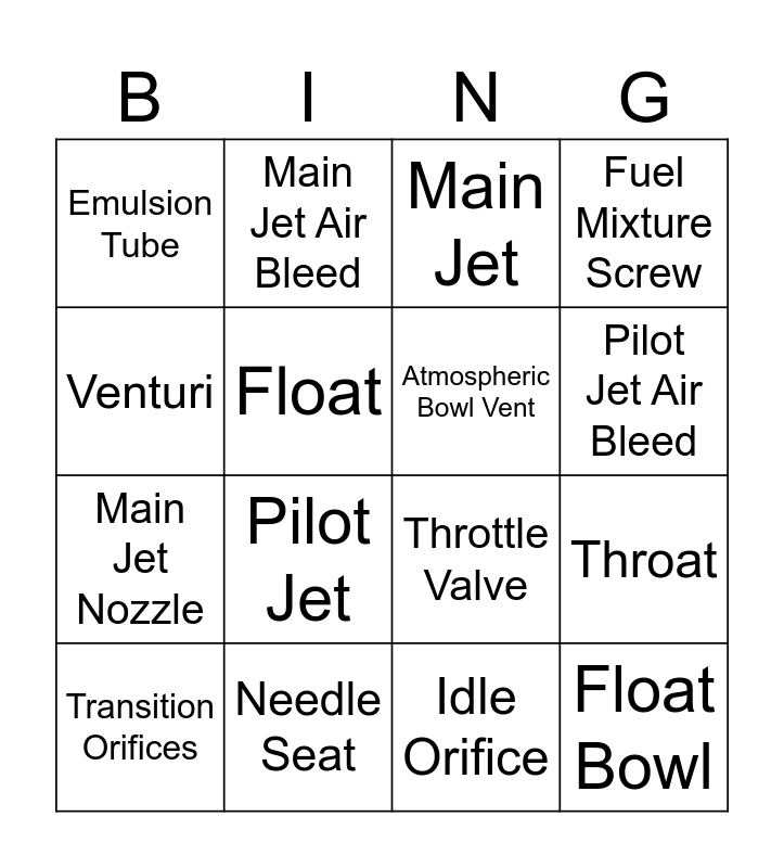 This bingo card has 20 words: Throat, Needle Valve, Main Jet, Float Pin, Transition Orifices, Venturi, Needle Seat, Emulsion Tube, Main Jet Nozzle, Main Jet Air Bleed, Pilot Jet, Throttle Valve, Float, Float Bowl, Atmospheric Bowl Vent, Choke Valve, Pilot Jet Air Bleed, Fuel Mixture Screw, Idle Orifice and Enricher Valve.