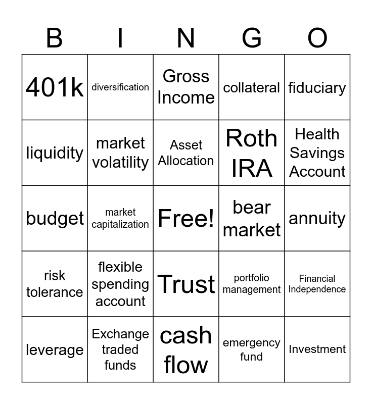This bingo card has a free space and 39 words: certified financial planner, refinancing, yield curve, market volatility, leverage, Trust, Asset Allocation, compound interest, fiduciary, risk tolerance, market capitalization, collateral, Investment, annuity, bear market, flexible spending account, Time Value of Money, 401k, exchange rate, portfolio management, liquidity, cash flow, Roth IRA, Health Savings Account, Principal, Capital Gains, Life Insurance, Net Worth, Rebalancing, diversification, personal finance, Tax Deferred, Gross Income, Exchange traded funds, emergency fund, health reimbursement arrangement, Financial Independence, budget and interest.