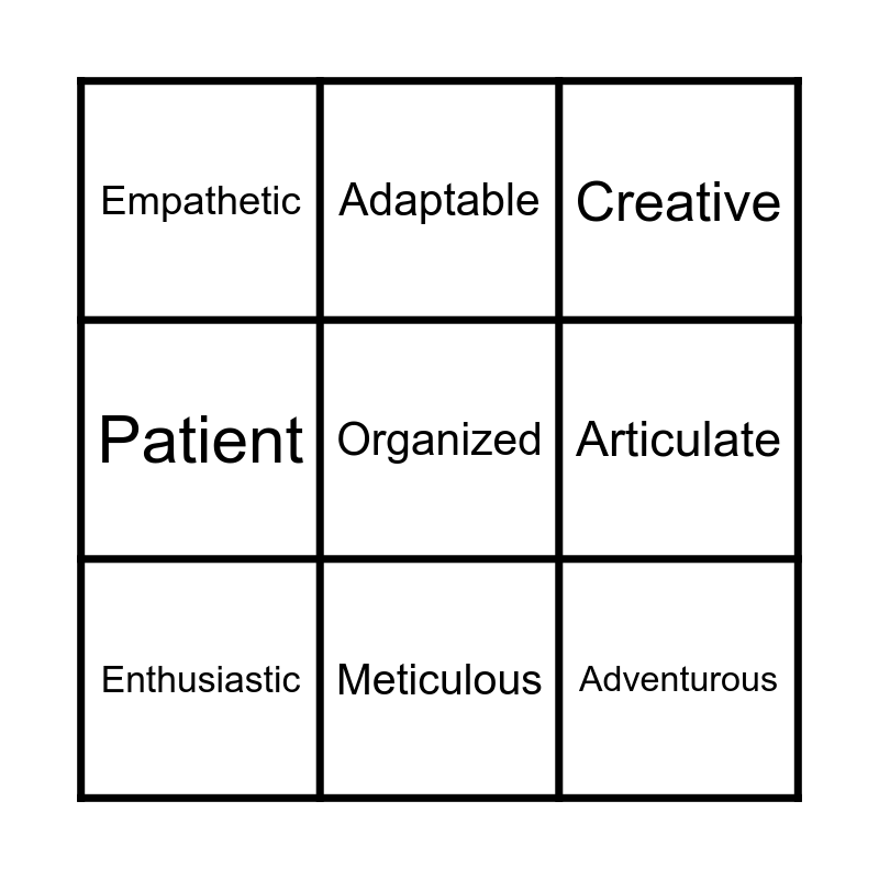 This bingo card has a free space and 8 words: Articulate, Creative, Adaptable, Enthusiastic, Empathetic, Adventurous, Patient and Meticulous.