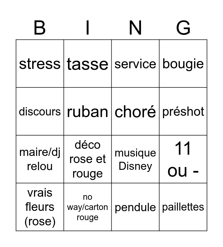 This bingo card has 16 words: no way/carton rouge, 11 ou -, service, stress, maire/dj relou, tasse, musique Disney, pendule, discours, ruban, vrais fleurs (rose), bougie, déco rose et rouge, préshot, choré and paillettes.